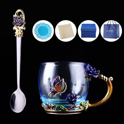 Handmade Beauty And Novelty Enamel Cup is made of high-quality eco-friendly metal and crystal clear glass, finished with crystals and enamel, this mug is a unique art between vintage, dreamy and luxurious style. It will improve your lifestyle and artistic accomplishment. Stand out with butterfly and rose flower designs on it, we believe it will become your favorite glassware, and it can even be used as a decorative piece for your kitchen and house!