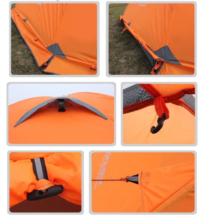 Outer tent– PU3500MM polyester with the 210T waterproof coating. Inner tent — 210T breathable polyester and B3 mesh. Bottom — PU4000MM Oxford bottom with 210D waterproof coating. Moreover, this Snow Skirt Double Layer 4 Season Tent in a small and ultra-light package, so suitable for easy carrying and storage. Convenient your excursions during long hikes!